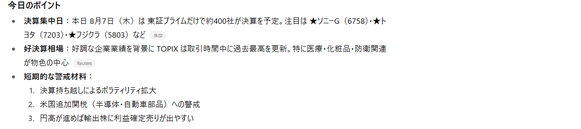明日(2025年8月8日)の決算発表予定について、午前中に発表される銘柄は一部のみ判明しており、未定の銘柄も多いのが現状です。