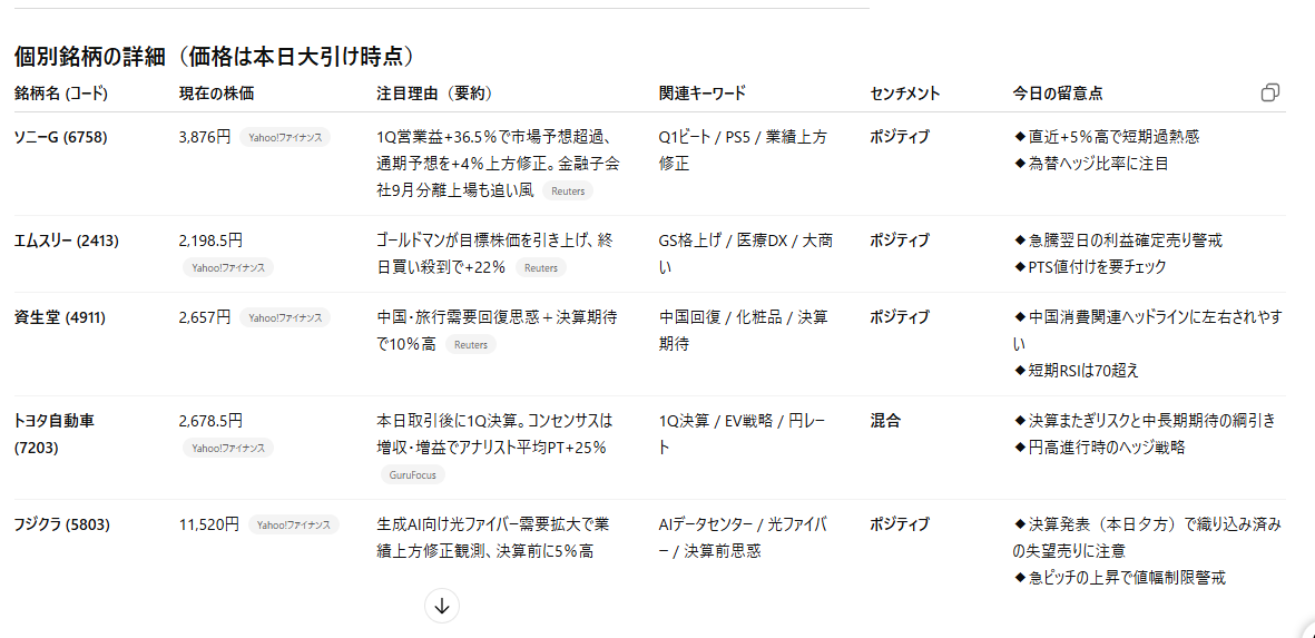 - 例えば、IHI(7013)や清水建設(1803)などは過去に午前中に発表した実績がありますが、今年も同様かは確定していません。